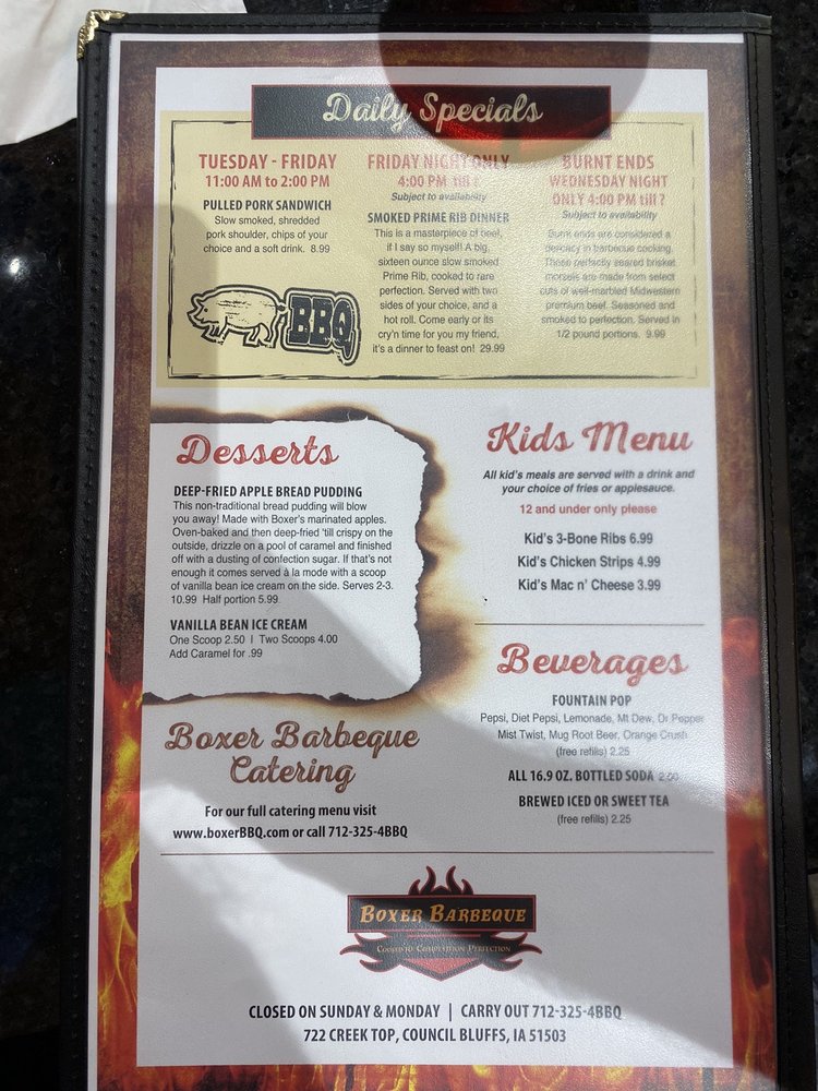 Boxer BBQ, located in Council Bluffs, IA, is a top-notch barbecue spot offering a wide range of mouth-watering dishes. Customers rave about the tender and flavorful Burnt Ends, the delicious Moo'ing Pig sandwich, and an array of tasty sides like Cornbread, Baked Beans, and Onion Rings. Not to be missed is the Fried Caramel Apple Bread Pudding dessert, which is simply amazing. The rustic decor adds to the dining experience, making it a great place to celebrate special occasions. With a dedicated parking lot, easy street access, and the option for reservations, Boxer BBQ is a popular choice for both locals and visitors. Whether you're craving brisket, catfish, or smoked prime rib, this restaurant offers something for every barbecue lover. With attentive and friendly staff, excellent food quality, and reasonable pricing, Boxer BBQ is a must-visit destination for anyone looking for a memorable dining experience.